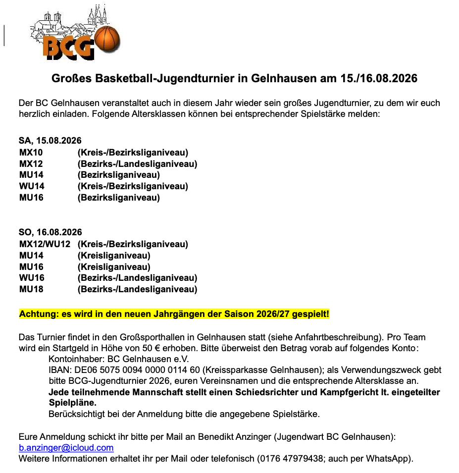 Großes Basketball-Jugendturnier in Gelnhausen am 15./16.08.2026